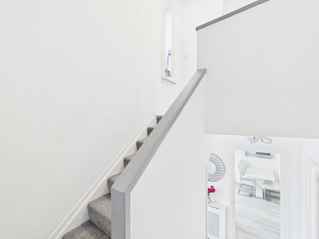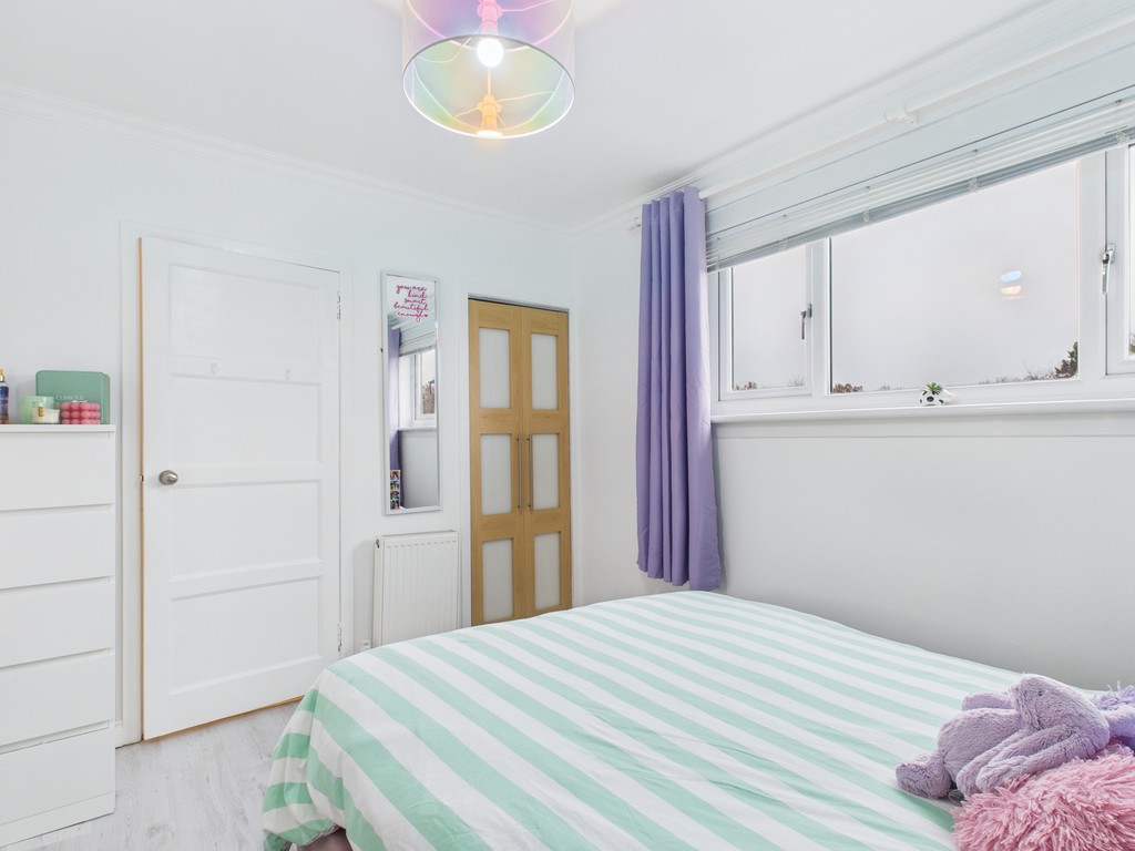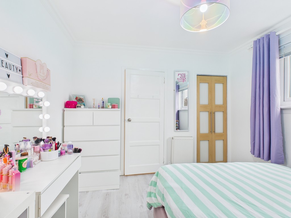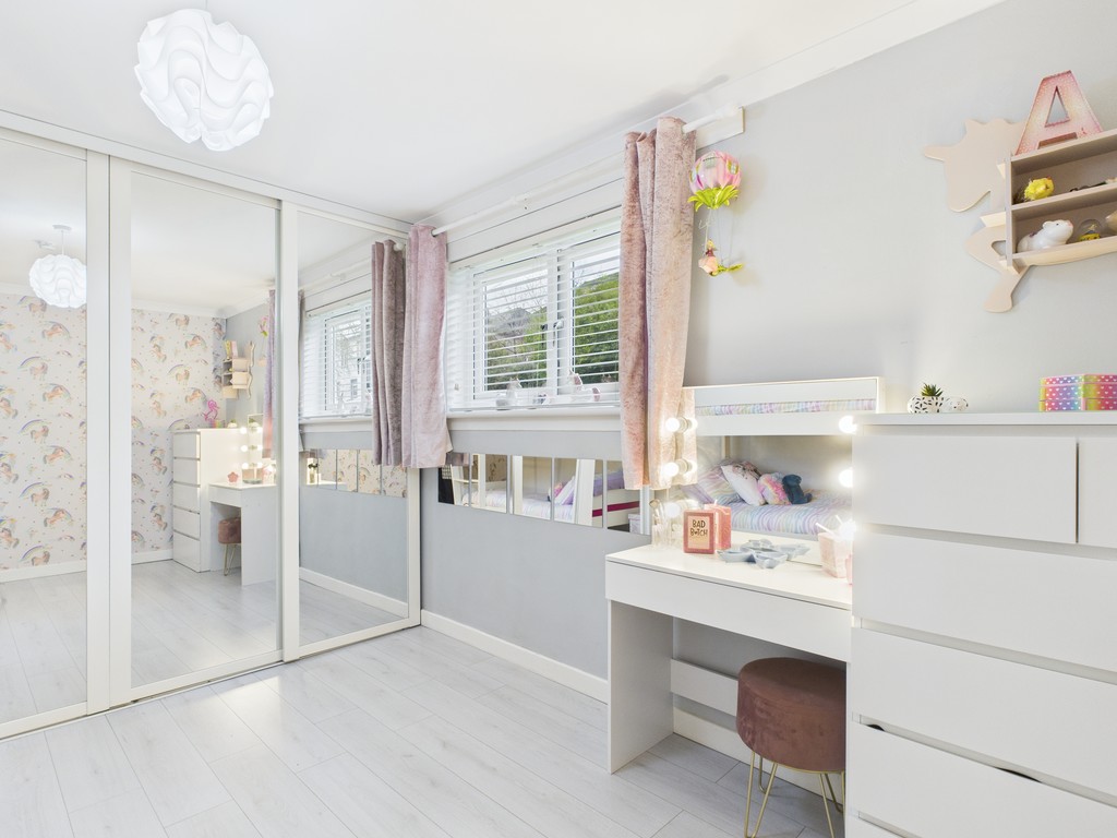 The upper landing is accessed via a staircase finished with plush charcoal carpeting, leading to three well-proportioned double bedrooms. Light oak flooring continues throughout, enhancing the sense of flow and warmth. Each room benefits from large picture windows that fill the space with natural light, while the master bedroom boasts impressive floor-to-ceiling fitted wardrobes, providing excellent storage. All bedrooms comfortably accommodate a variety of furnishings.