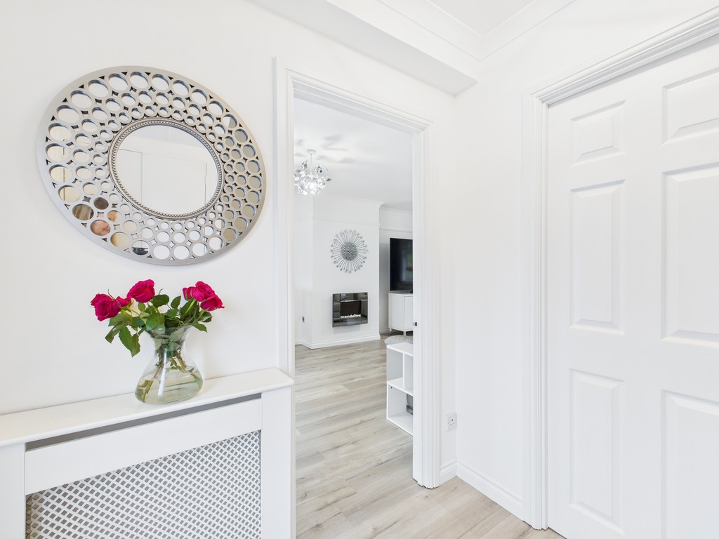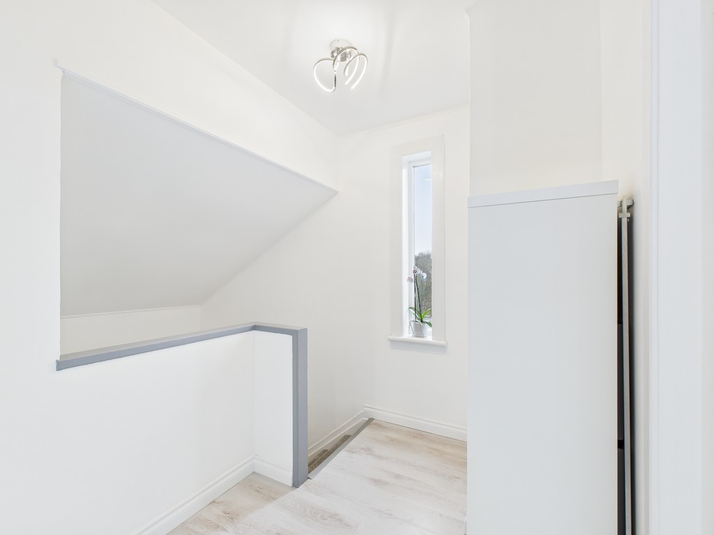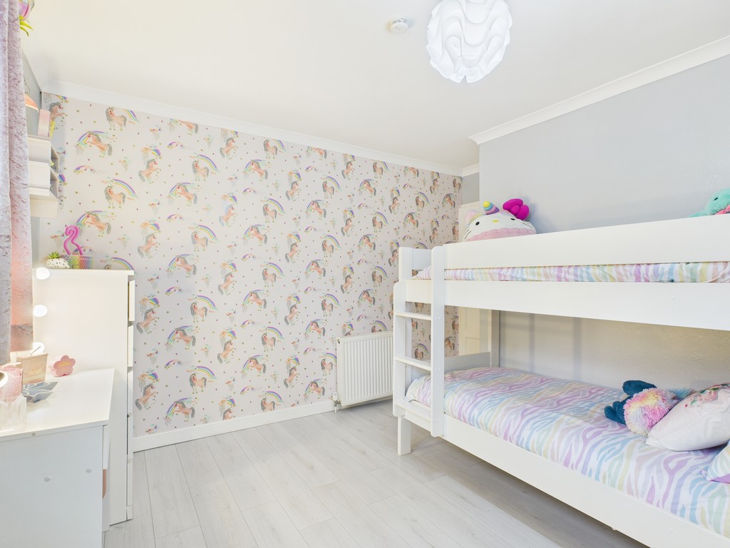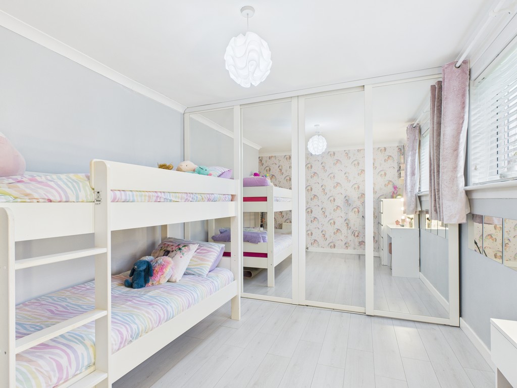 The upper landing is accessed via a staircase finished with plush charcoal carpeting, leading to three well-proportioned double bedrooms. Light oak flooring continues throughout, enhancing the sense of flow and warmth. Each room benefits from large picture windows that fill the space with natural light, while the master bedroom boasts impressive floor-to-ceiling fitted wardrobes, providing excellent storage. All bedrooms comfortably accommodate a variety of furnishings.