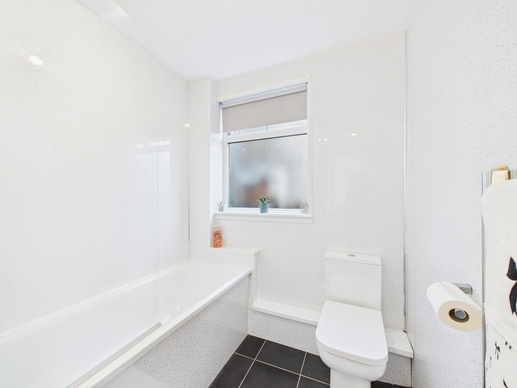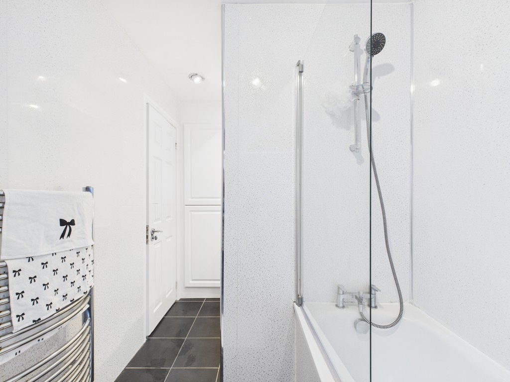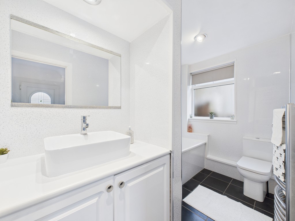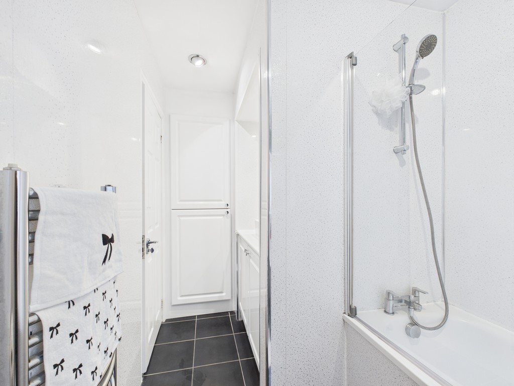 Completing the lower level is the impressive family bathroom, finished to a high standard with white wet wall panels and elegant black tiled flooring. This generous space features a modern three-piece suite comprising WC, vanity unit with counter-top sink and mirror, and bath with thermostatically controlled overhead shower. A large integrated storage cupboard offers ample room for towels and toiletries.