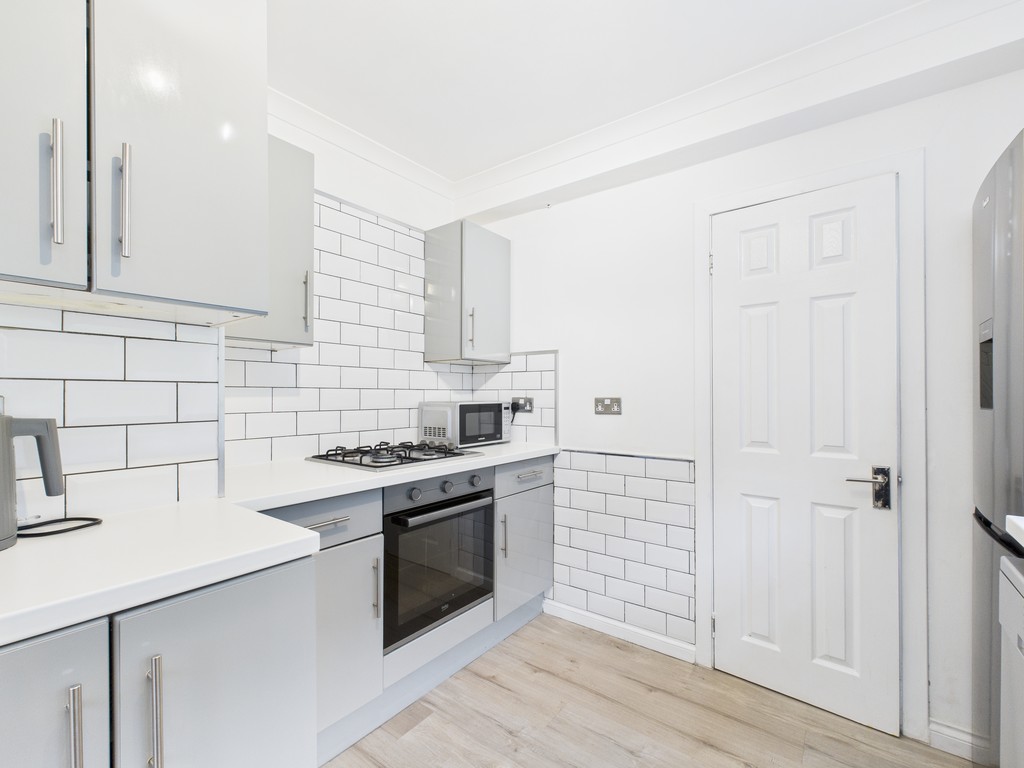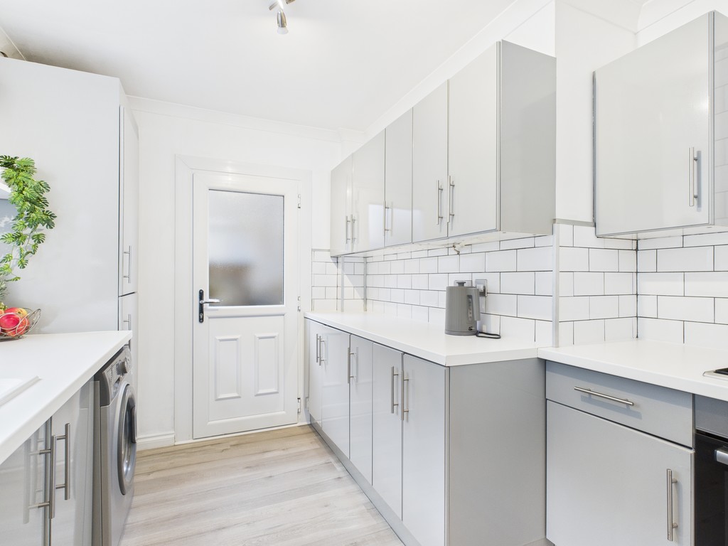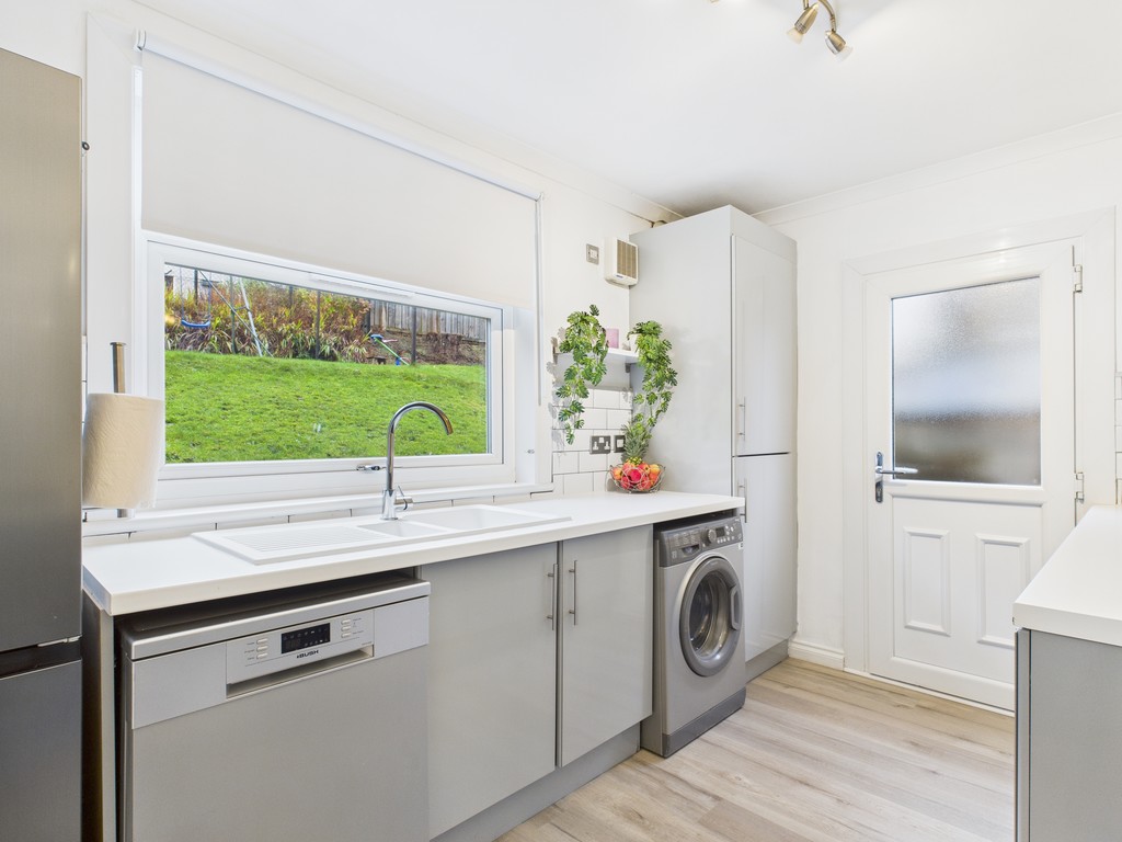 Located off the lounge, the stylish modern kitchen is fitted with a range of gloss light grey cabinetry, complemented by white laminate worktops and metro-style tiled splashbacks. The kitchen is well-equipped with an electric oven, four-burner gas hob, and dedicated space and servicing for a washing machine, dishwasher, and fridge freezer. A rear door provides convenient access to the garden.