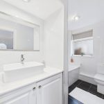 Completing the lower level is the impressive family bathroom, finished to a high standard with white wet wall panels and elegant black tiled flooring. This generous space features a modern three-piece suite comprising WC, vanity unit with counter-top sink and mirror, and bath with thermostatically controlled overhead shower. A large integrated storage cupboard offers ample room for towels and toiletries.