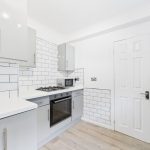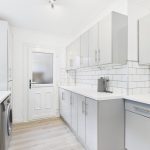 Located off the lounge, the stylish modern kitchen is fitted with a range of gloss light grey cabinetry, complemented by white laminate worktops and metro-style tiled splashbacks. The kitchen is well-equipped with an electric oven, four-burner gas hob, and dedicated space and servicing for a washing machine, dishwasher, and fridge freezer. A rear door provides convenient access to the garden.