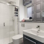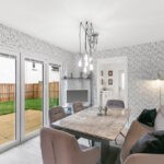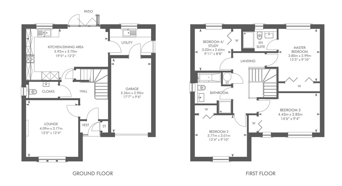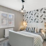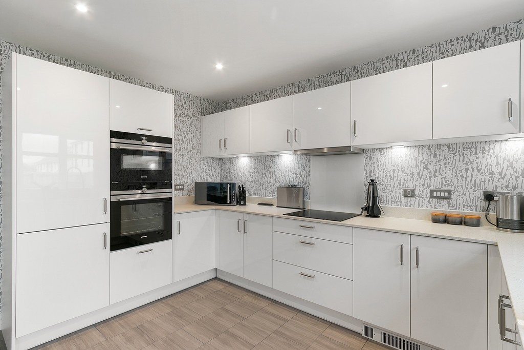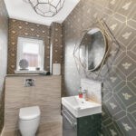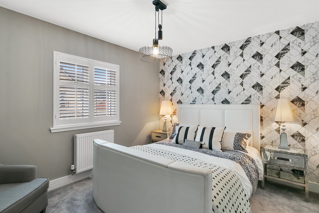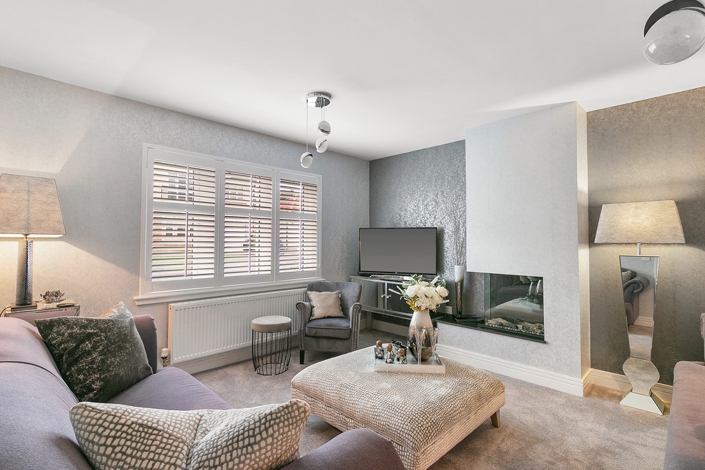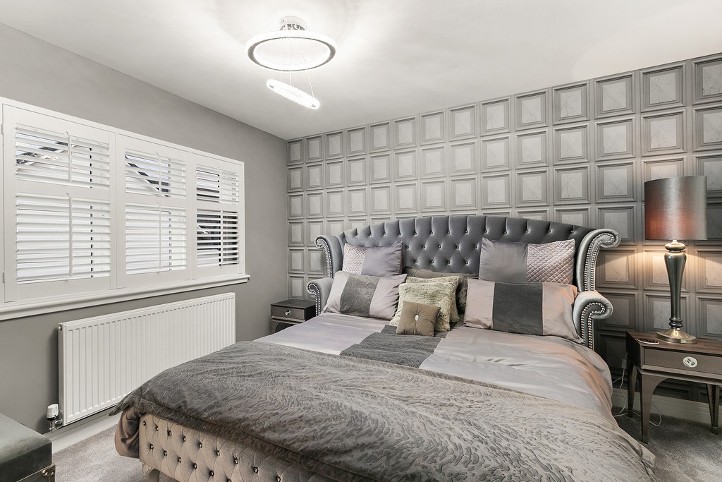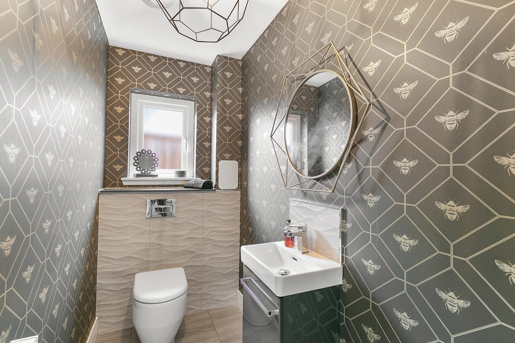 Entrance to the property is through a welcoming vestibule which benefits from a useful storage cupboard with the reception hallway painted in crisp white and laid in bleached walnut Amtico flooring which continues through the dining kitchen, W/C and utility room. The lounge to the left of the hallway is generously dimensioned, replete with en trend light grey hues and metallic accents with the large triplicate picture window which bathes all aspects of the space with natural sunlight, further showcasing the munificent proportions on offer and with pure white wooden window shutters affording privacy when required. The downstairs cloakroom is finished with premium fixtures including Porcelanosa Ona Blanco tiles, low flush w/c and modern grey gloss vanity unit with designer chrome mixer tap. The spacious open plan dining kitchen is designed and complete to a high specification; with quartz worktops and fully integrated with premium appliances creating a clean linear feel. The beautiful kitchen is fitted with both floor and wall cabinetry in white gloss with chrome handles and a clever soft-close design and equipped with Siemens appliances including a full size dishwasher, larder style fridge freezer, double oven and induction hob with extractor fan and glass splash back. The light and bright space is flooded in natural light from the large picture window and bi-folding patio doors allowing the space to open up and invite the outdoors inside. The utility room just off from the dining area is finished with the same high specification as the kitchen with ample space to accommodate a washing machine and tumble dryer. The utility also gives access to the fully powered garage and houses the boiler.