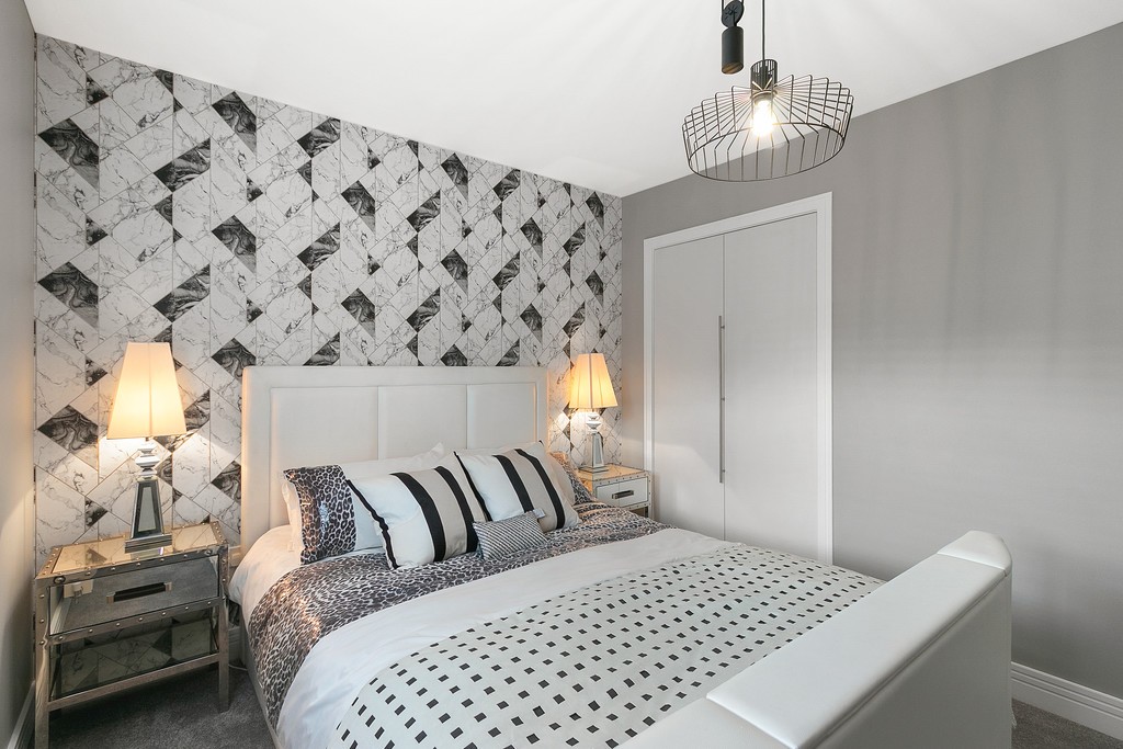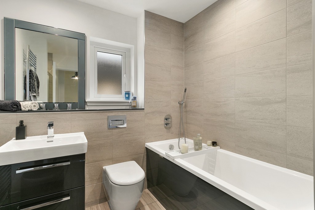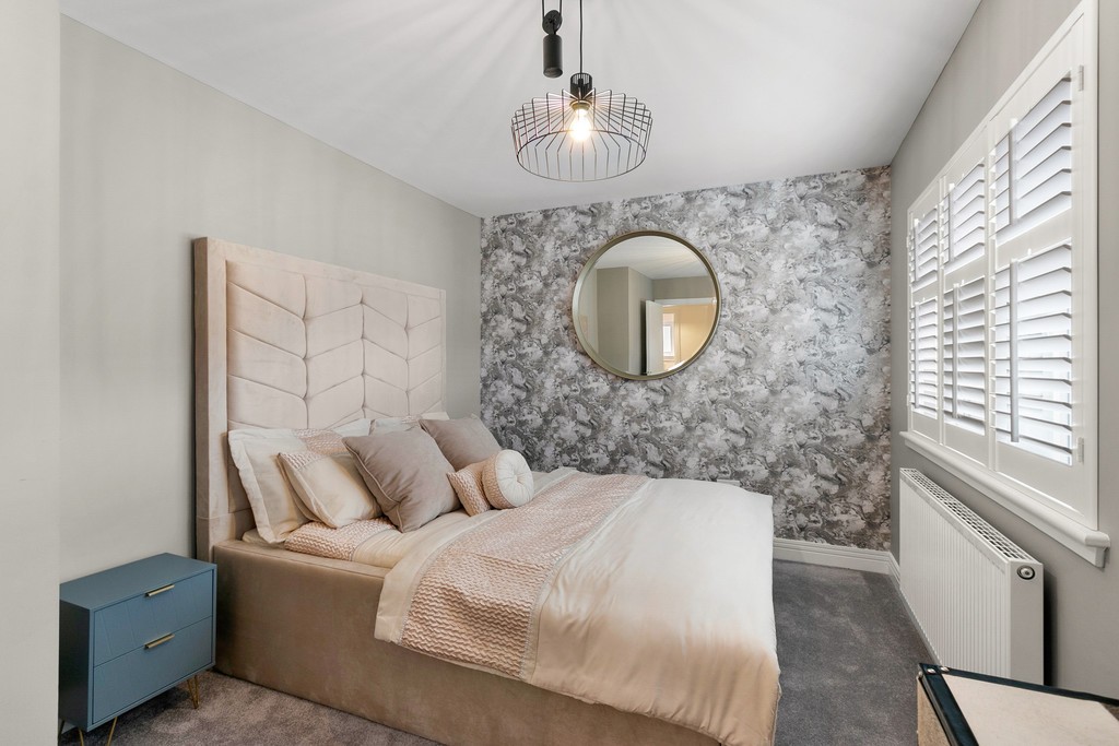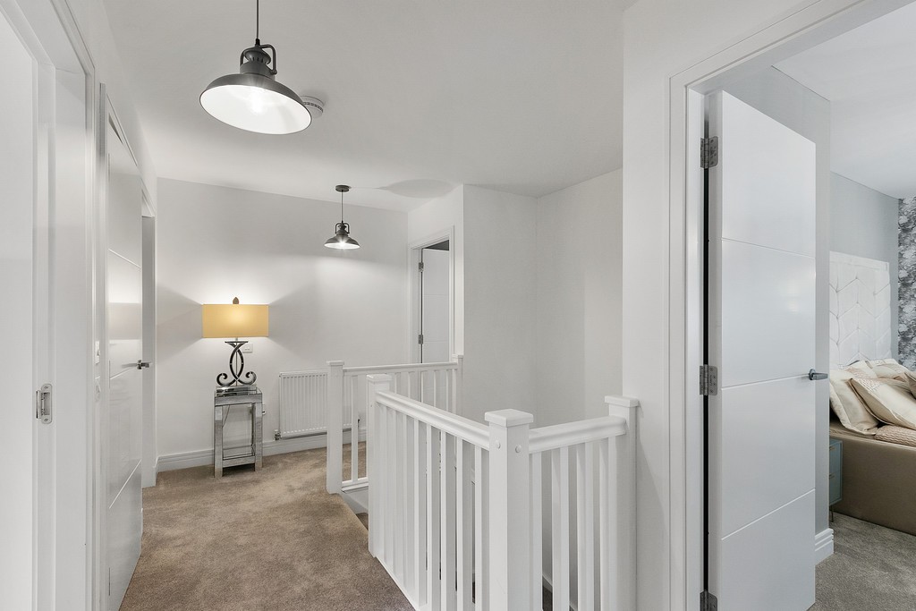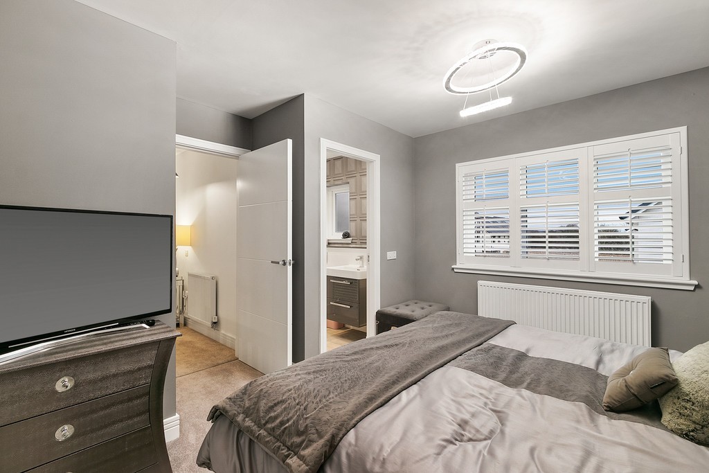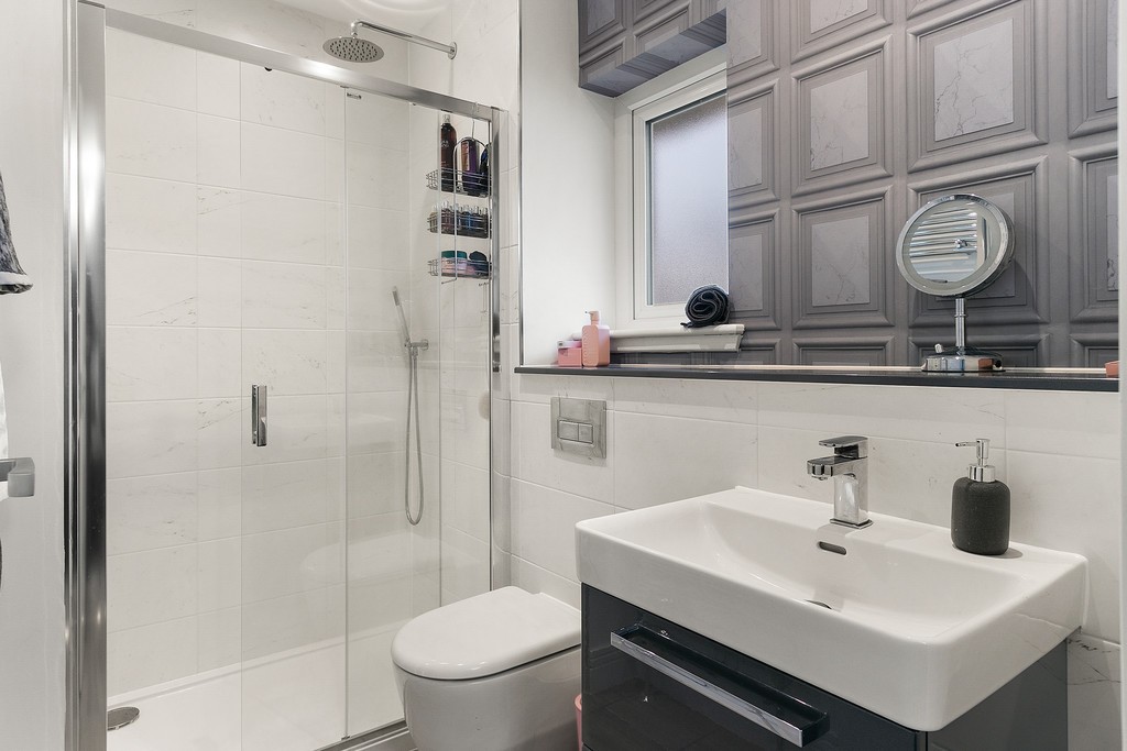 Upstairs, the four double bedrooms have been carpeted in thick pile, adding once more to the sense of thoughtful luxury created by the vendor of the property. The walls are also finished in modern tones with a feature wall in each bedroom, creating an open airy feel to each individual room. The master bedroom features built in double wardrobes as well as a large tiled en-suite, finished in modern white ceramic fitments and gloss finish vanity. There is a large walk in power shower with a large chrome heated towel rail adding to the feeling of warmth and opulence. The second and third bedrooms also have built in wardrobes and a versatile fourth room which could be utilised as a home office, dressing room or indeed further bedroom also further benefits inbuilt storage. The upper hallway landing area has a handy storage cupboard. The three piece bathroom has also been fully tiled throughout and further benefits from a bath and separate shower enclosure, as well as a further chrome towel rail.