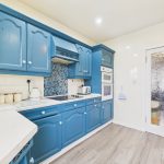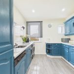 Modern kitchen with striking blue units and double oven
