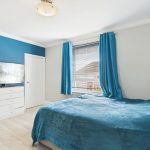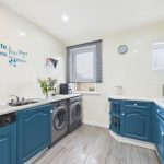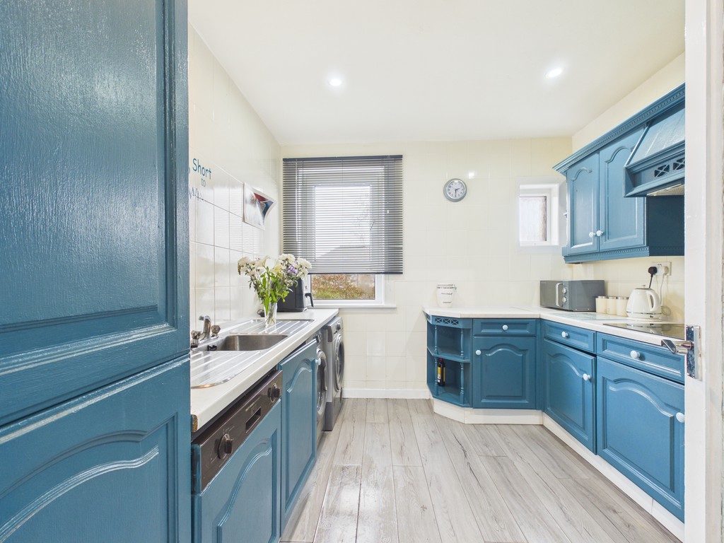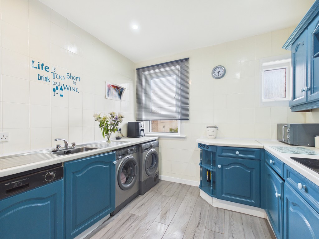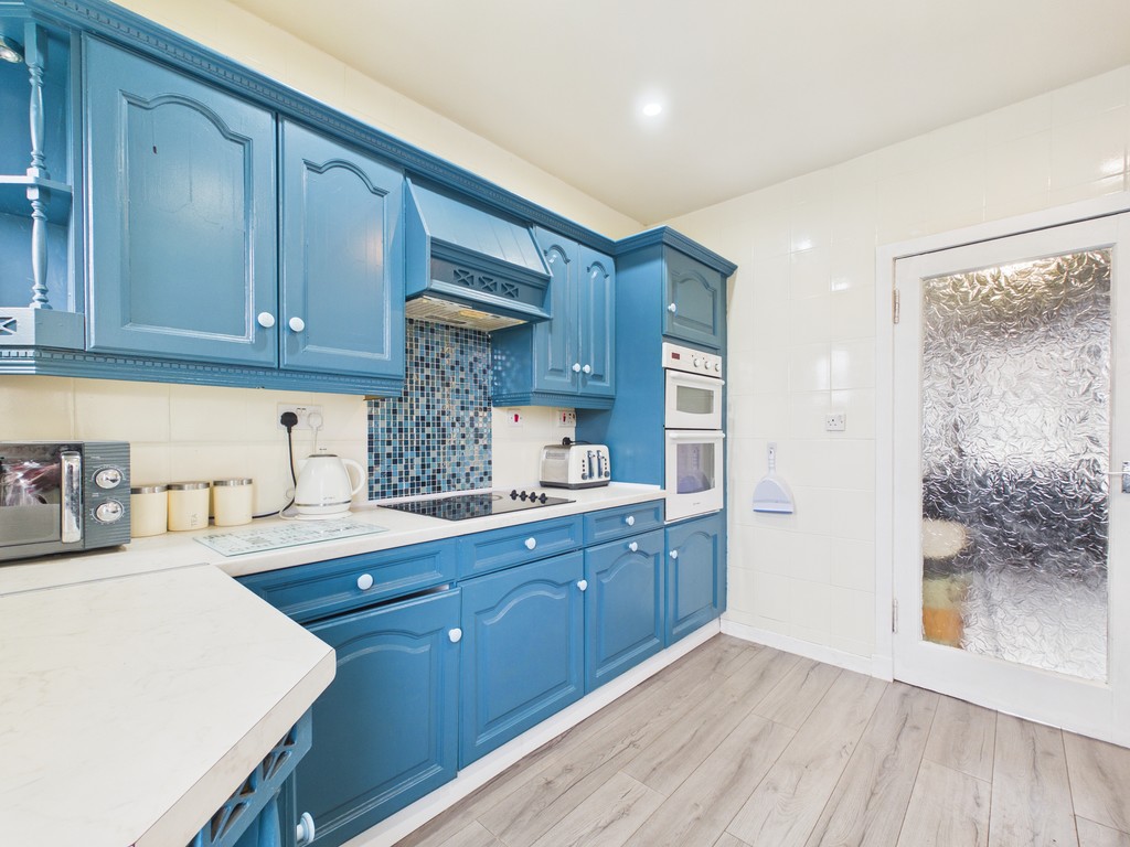 The kitchen is accessed directly from the lounge and offers a modern and eye-catching finish with striking blue wall and floor units. It is well-equipped with an electric double oven and hob, along with space and servicing for a washing machine, dishwasher, tumble dryer, and fridge freezer.