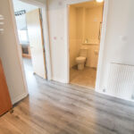 Completing the living space is a striking bathroom fitted with a contemporary Porcelanosa three piece suite in gloss white, with combi-flush w.c, stainless steel mono mixer tap atop the wall mounted basin and electric power shower over the bath. A feature bulkhead with woven white gloss porcelain tiling provides a handy storage option, with glass shower screen and grey vinyl flooring further ancillary inclusions.