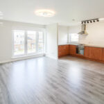The hallway leads to all apartments off and has been laid with newly installed quality laminate flooring in en trend light grey oak accentuated with freshly painted walls in cotton white matte - this décor scheme flows seamlessly through the footprint of the flat. Generously proportioned and dimensioned, the lounge is the focal point of the accommodation with double floor to ceiling glass doors to the Parisienne balcony providing stunning views of the river and beyond. This room shares it's space with a delineated larger style galley kitchen, defined with vinyl flooring in tonal grey swirl effect, beautifully complementing the grey laminate. The kitchen has been fitted with base cabinetry finished in slab cherry-wood and topped with speckled grey granite effect laminate work surfaces, giving a sharp, linear look and finish. A double bank of drawers, integrated washing machine, freestanding condenser tumble dryer and larder fridge freezer, one and a half sink and drainer in stainless steel with matching four burner gas hob, oven and extract hood ensures the space is replete with all the components to assist with the demands of modern life. A splashback in white metro style ceramic tile and tilting LED spotlights are additional upgrades recently installed.