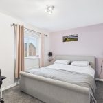 Upstairs, the property boasts two well-proportioned double bedrooms. The master bedroom is enhanced by fitted wardrobes with sleek mirrored doors, maximising both storage and light. The upper hallway includes a built-in storage cupboard and access to the loft. The family bathroom is fully tiled and features a crisp white three-piece suite, complete with a thermostatically controlled shower over the bath.