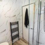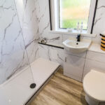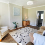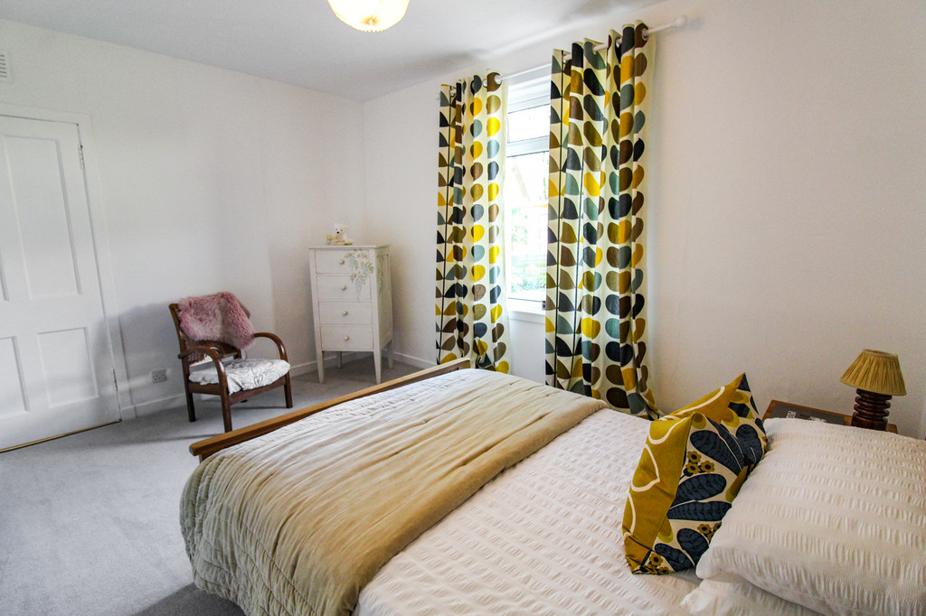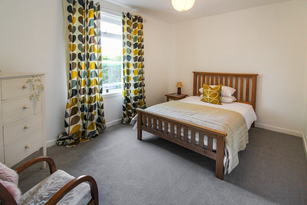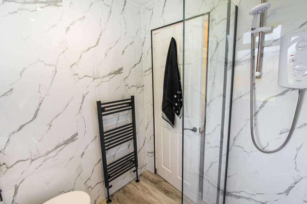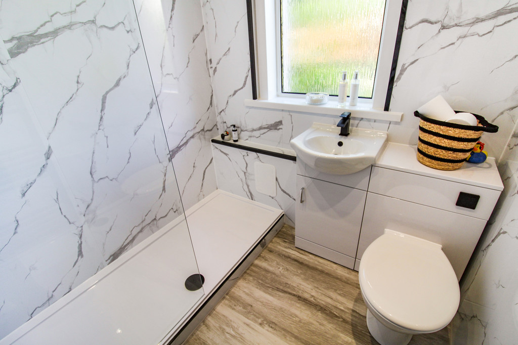 Both double bedrooms are spacious and versatile, easily accommodating a range of furnishing, and benefit from large windows that brighten the space and create an open feel. The recently refurbished shower room is finished in stylish modern tones and features a sleek two-piece suite with enclosed electric shower and contemporary charcoal accents.