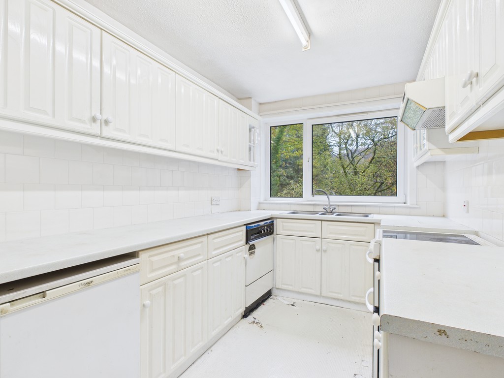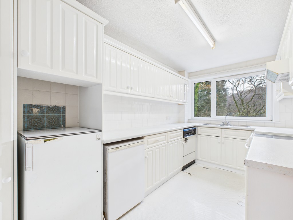 The kitchen is fitted with a range of wall and floor cabinets, along with space and servicing for a cooker, washing machine, dishwasher, and fridge freezer, offering the next owner the opportunity to modernise and create a stylish and functional workspace.