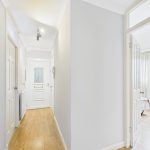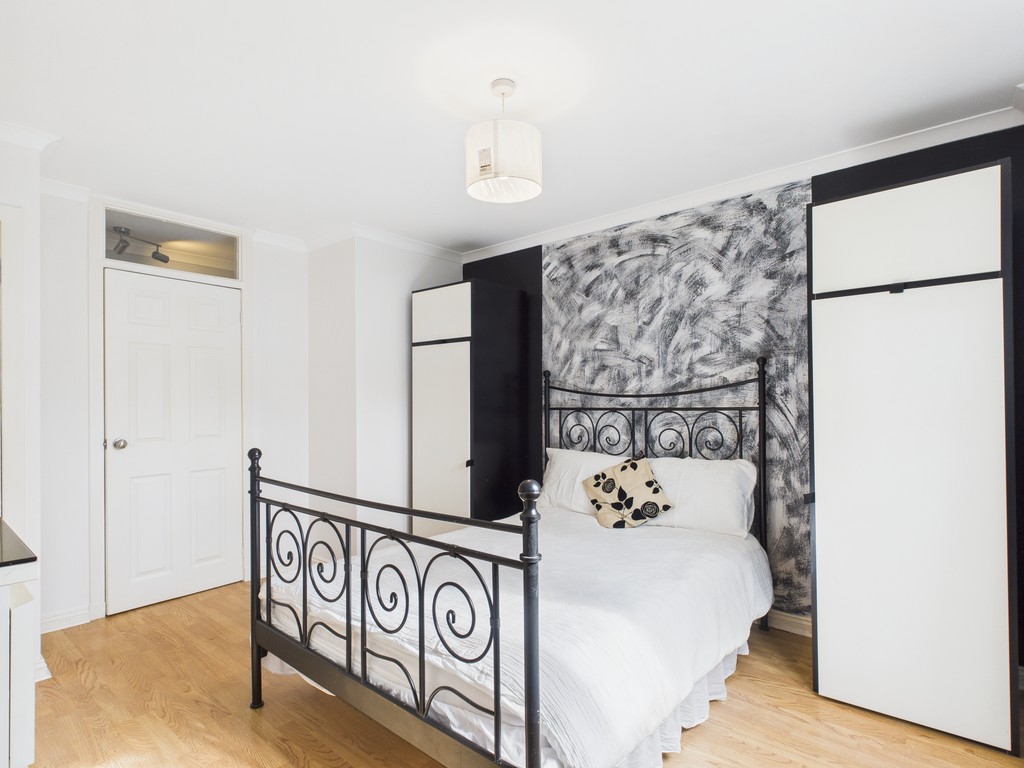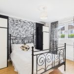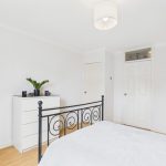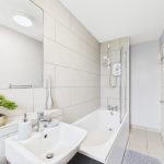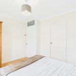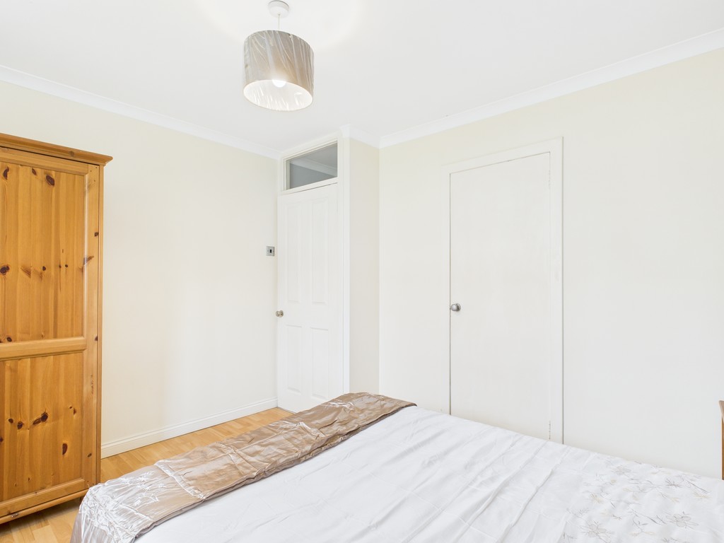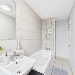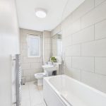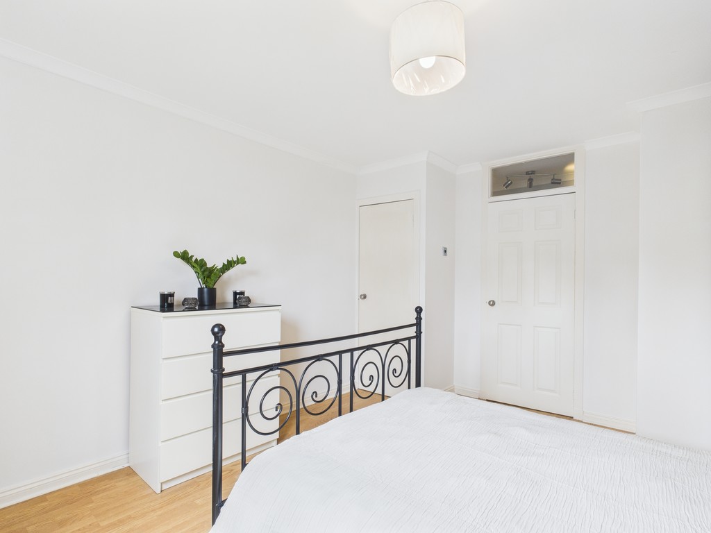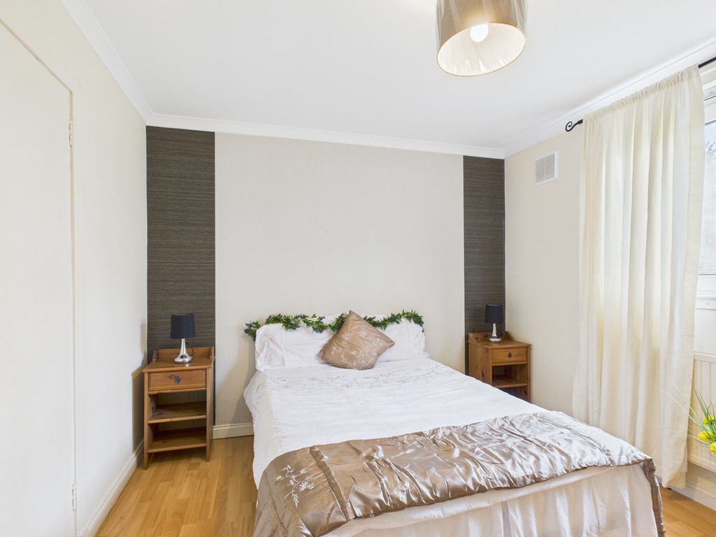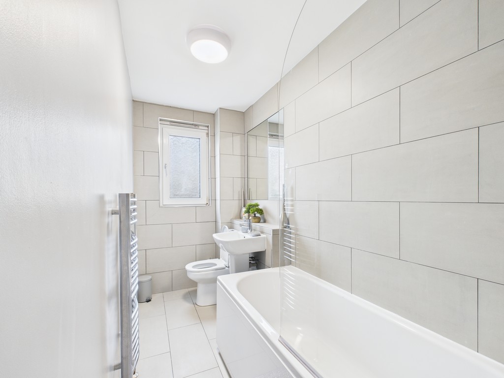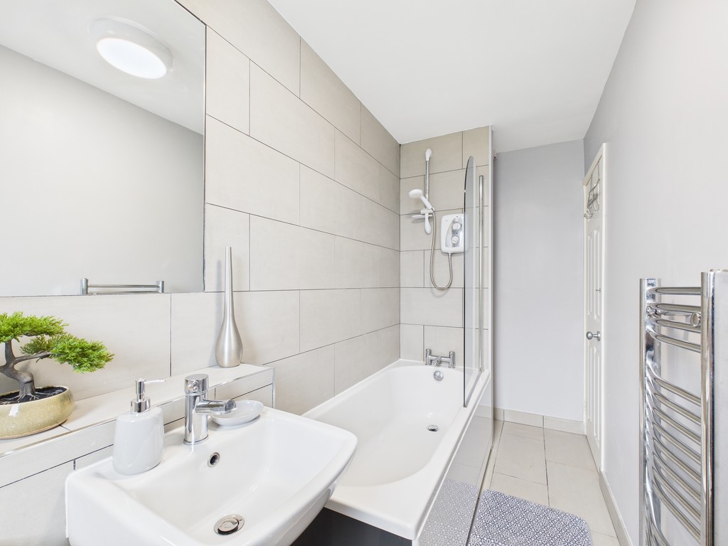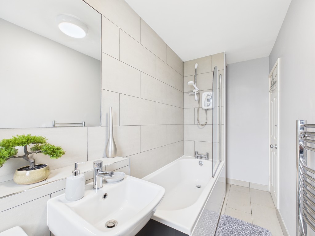 Both bedrooms are generous doubles, each offering built-in storage and continuing the neutral décor and quality laminate flooring. The bathroom has been upgraded in recent years and is fitted with a modern white three-piece suite, electric shower over the bath, a heated towel rail, and partial wall tiling for a contemporary finish.
