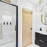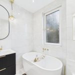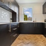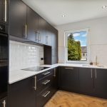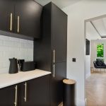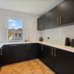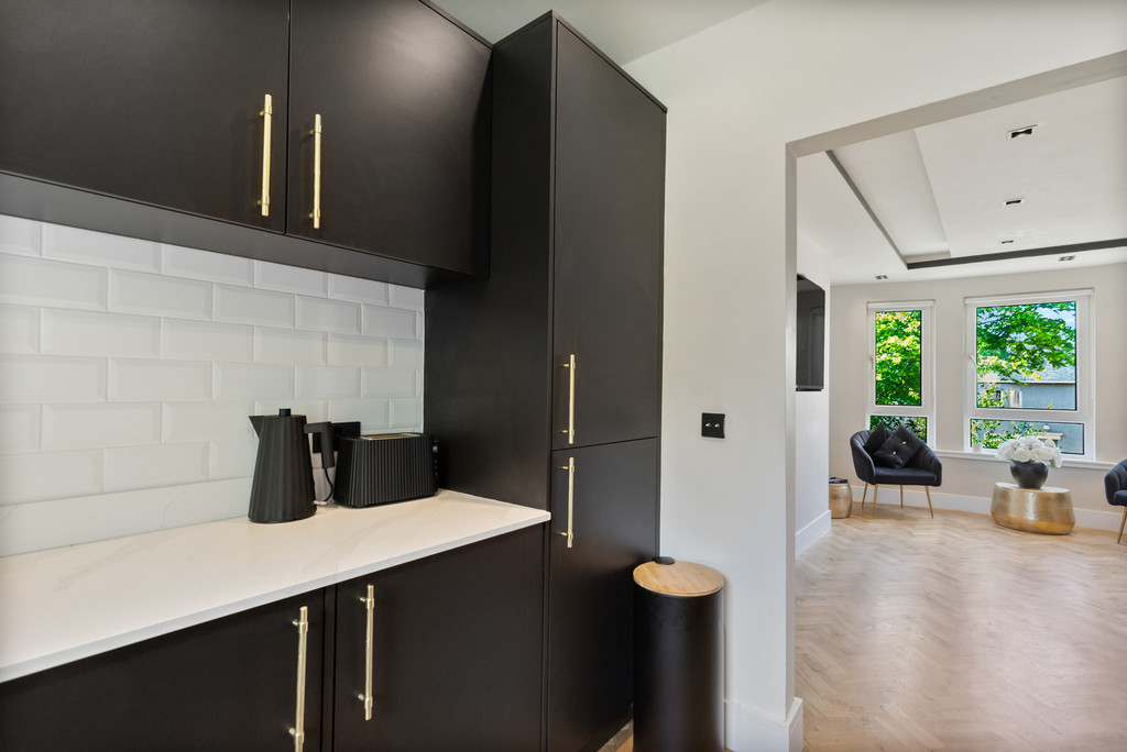To the front, the generously dimensioned living room is served by a triplicate bay window formation further enhancing the space on offer and affording open aspects. There is ample capacity for modern furnishings to include a dining suite for six people if desired without compromising proportions. Off the living room, the professionally designed and installed kitchen is a real treat to behold with individualist additions and unique touches added. Black coloured cabinetry paired with brass ironmongery, topped with Quartz work surfaces and matching wrap around upstands showcases a chic yet efficient work space. Fully equipped with convenience in mind, the room is replete with all that the culinary enthusiast desires when catering for dinner! The vendors have included all integrated appliances including fridge freezer, washing machine and dishwasher. A black double oven, electric hob and one and half inset sink with drainer and mixer over, ceramic tiled splash back are further thoughtful upgrades.