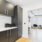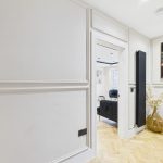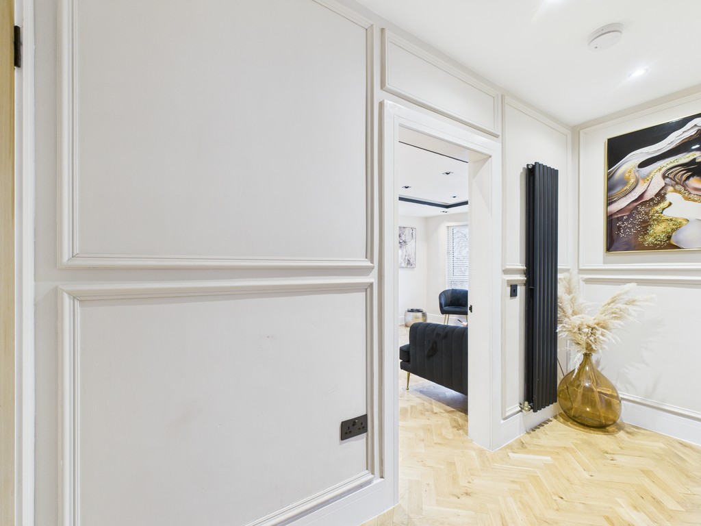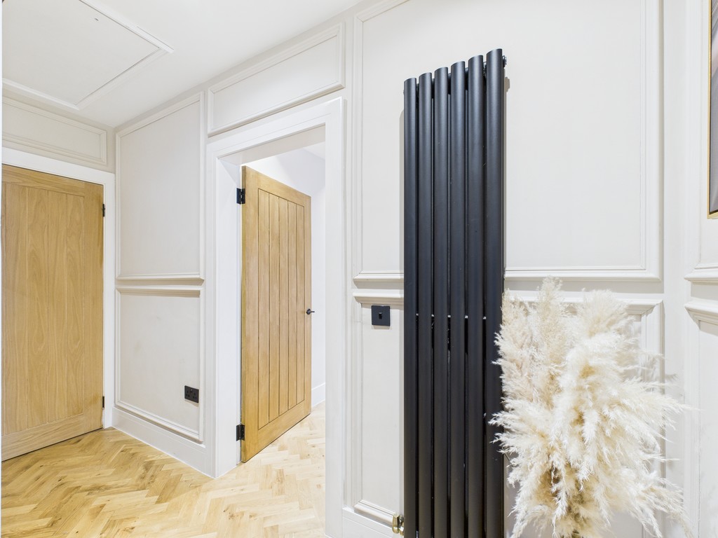 Nestled within a cul-de-sac and positioned away from passing traffic yet near to all amenities and transport links, this captivating apartment and gardens comes munificently dimensioned, proportioned, and comprehensively refurbished and equipped with premium fixtures and fittings. Additionally, this fantastic home offers off road parking - a rear find within the area! Access by way of paved drive to the front door at the side of the building, with ingress to the enclosed carpeted staircase decorated with bespoke cream wall panels and black handrail. The upper hallway sets the tone for all that lies within - light decor hues paired with oak internal doors and continual, seamless parquet flooring running across the entire footprint save the bathroom.